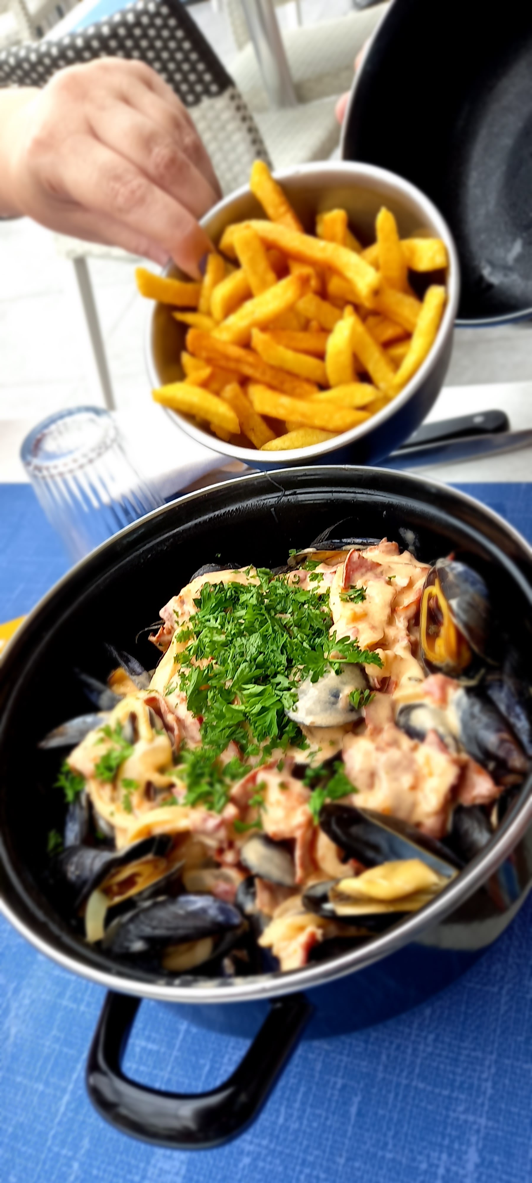 45 minutes d attente les gens qui arrivent apres nous sont servie avant une fois servie les frites sont a peine cuite la creme des moule et coupé a l eau et pour finir en beauté on paye le prix des moules au bleu alors que celle ci n'etais plus disponible a la carte donc si on voulais des moules s'etais mariniere ou a la creme pas le choix