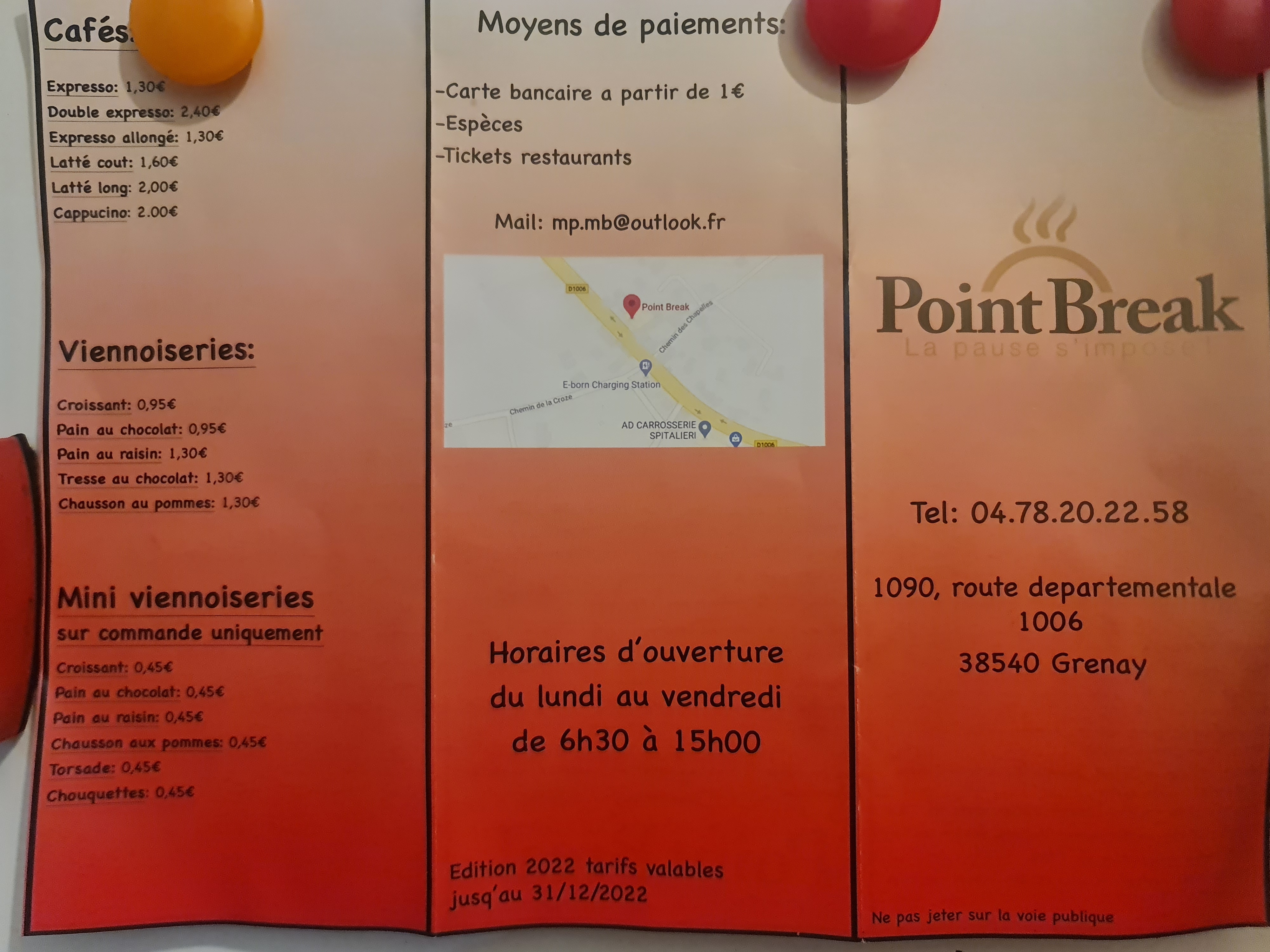 N'écoutez pas les mauvaises critiques, je suis allé à Point Break un midi car je n'avais pas de gamelle pour manger, très bon Panini je me suis régalé , très bon accueil, les gérants sont seulement deux pour une grosse influence le midi, je compatis, ça doit pas être facile tous les jours, mais courage. Je repasse ce midi ! =)