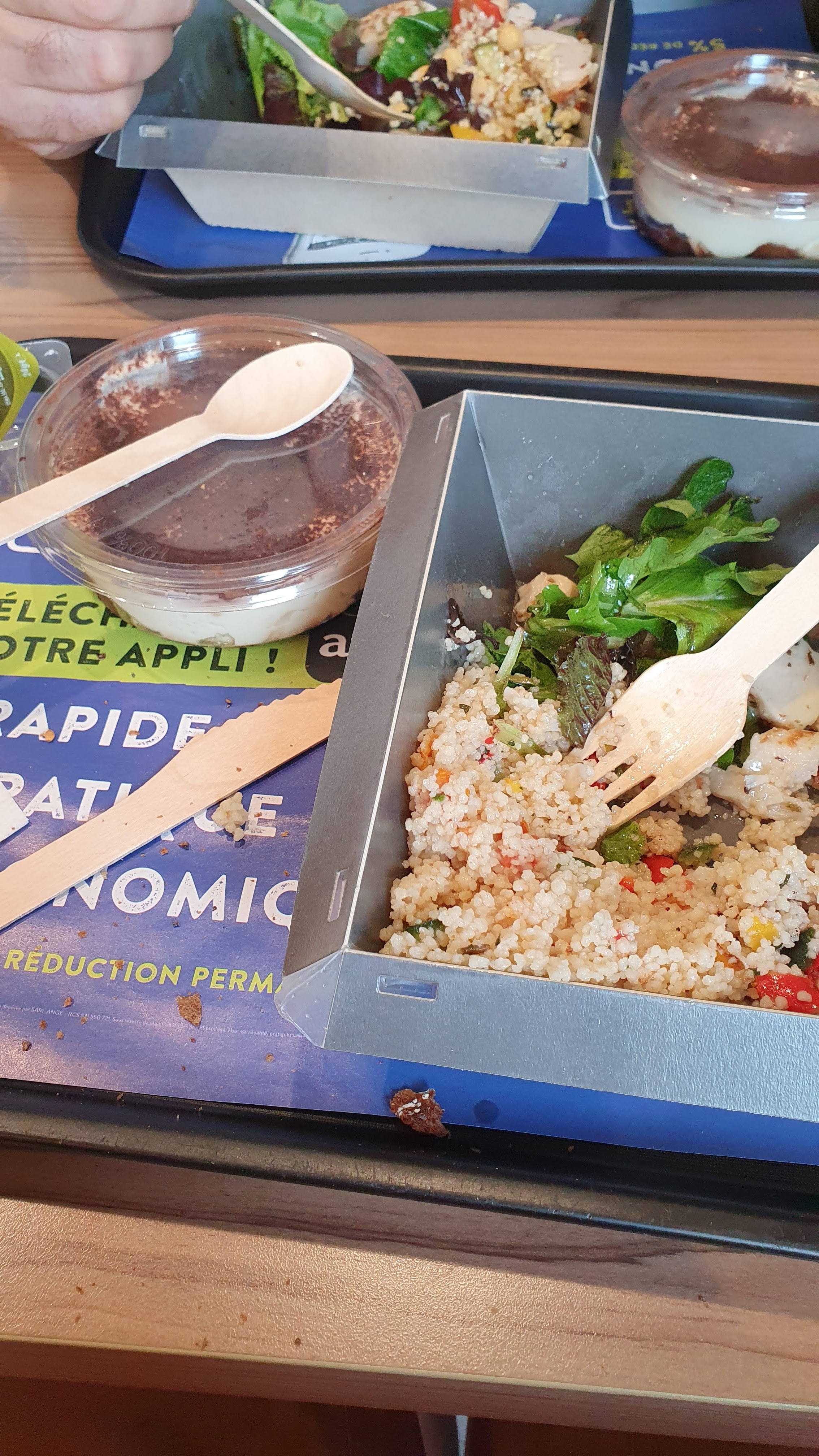 La commande faite via l'application n'a pas été satisfaisante. En effet, salade sans sauces, pas de couvert, pas de serviettes, pas de tranche de pain, bouteille d'eau et dessert changés par rapport à la commande. Beaucoup dimperfections pour une commande faite en avance ..... Cependant, bonne qualité des produits.