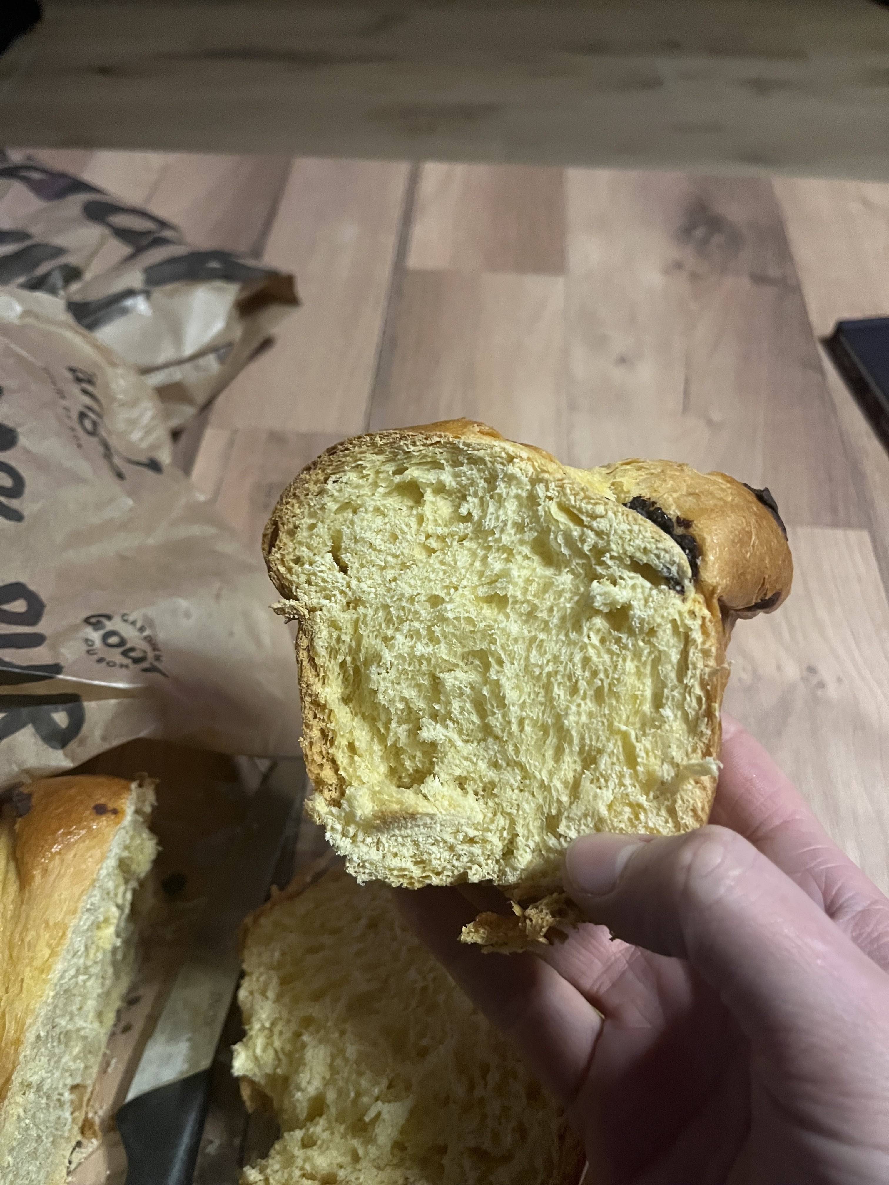 Bonjour brioche aux pépites de chocolat. Une fois coupé il n’y a rien dedans. Sa fait chère la brioche . Déçu .