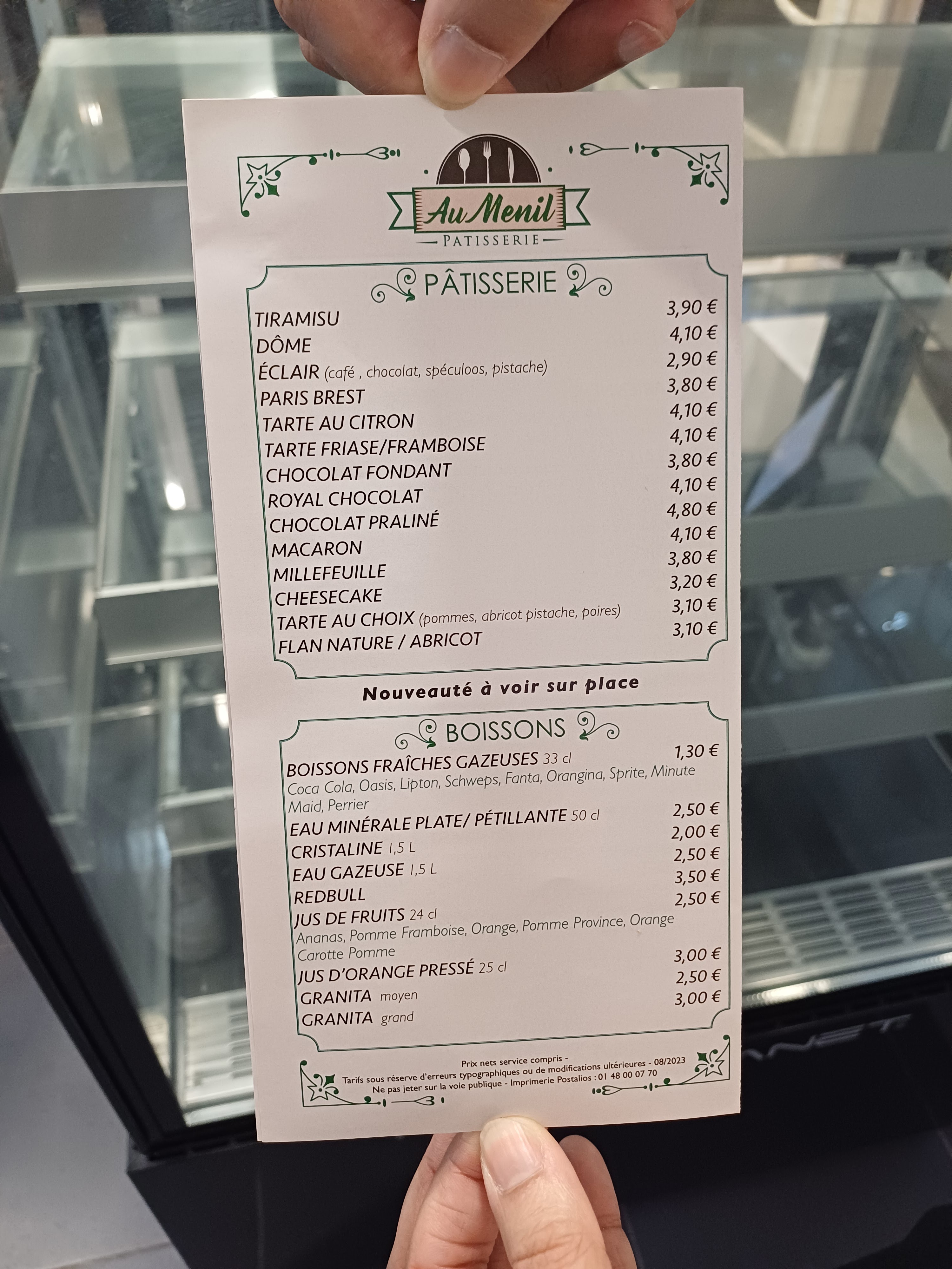 Dommage tout d'abord d'avoir conservé les notes de l'ancien occupant des lieux à savoir le Restaurant le Menil. Accueil sympathique, flan très bons, pâtes à choux des éclairs pas toujours du jour, pains aux chocolats dans la moyenne sans plus