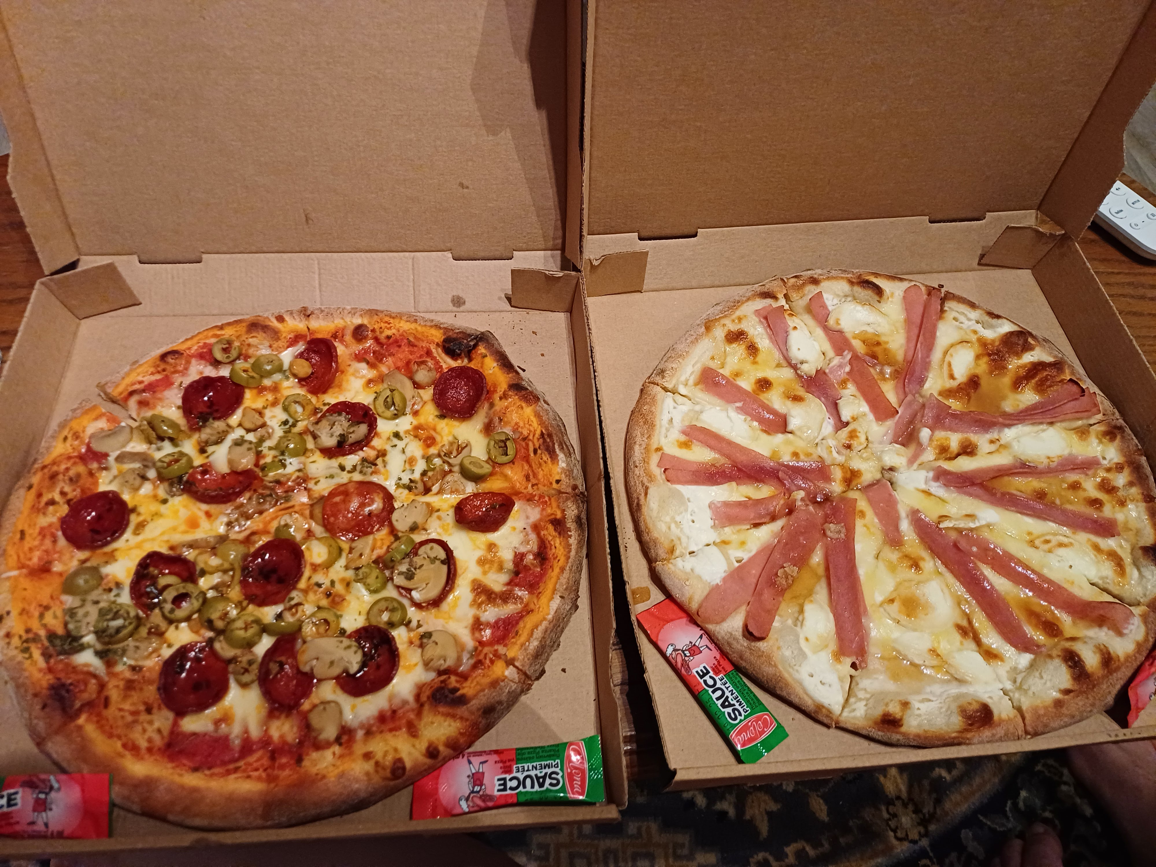 Bonnes pizzas, mais dommage que les champignons soient en boîte et les olives vertes