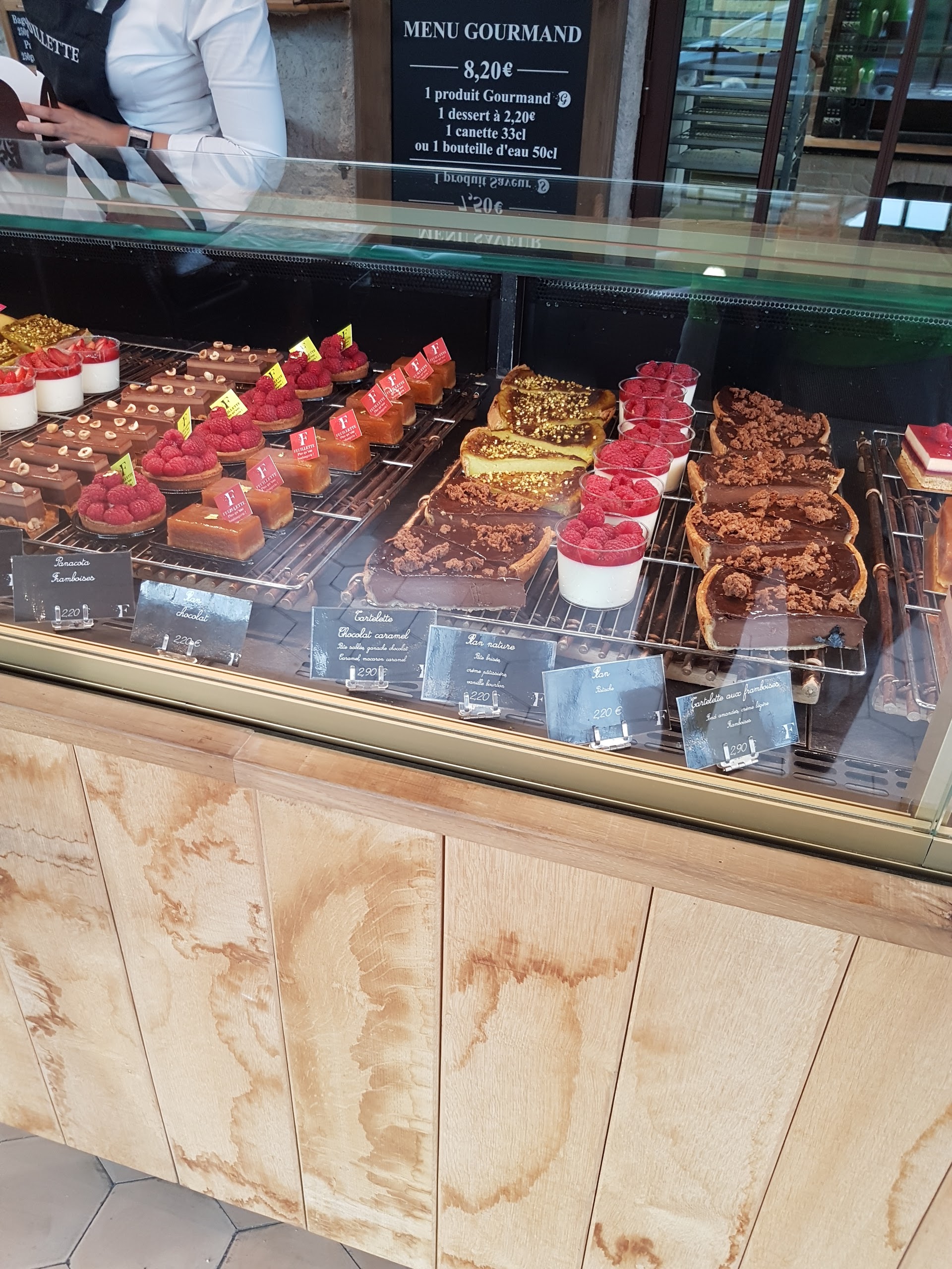 Feuillette est une boulangerie-pâtisserie. Le lieu est assez sympa avec de belles vitrines, un grand escalier menant à une salle pour déjeuner très agréable. Il y a une partie style bibliothèque avec feu de bois l’hiver. Le tout dans un style chalet en bois. On peut profiter également d’une grande terrasse à l’étage. Les fougasses, quiches et surtout les desserts sont à goûter absolument
