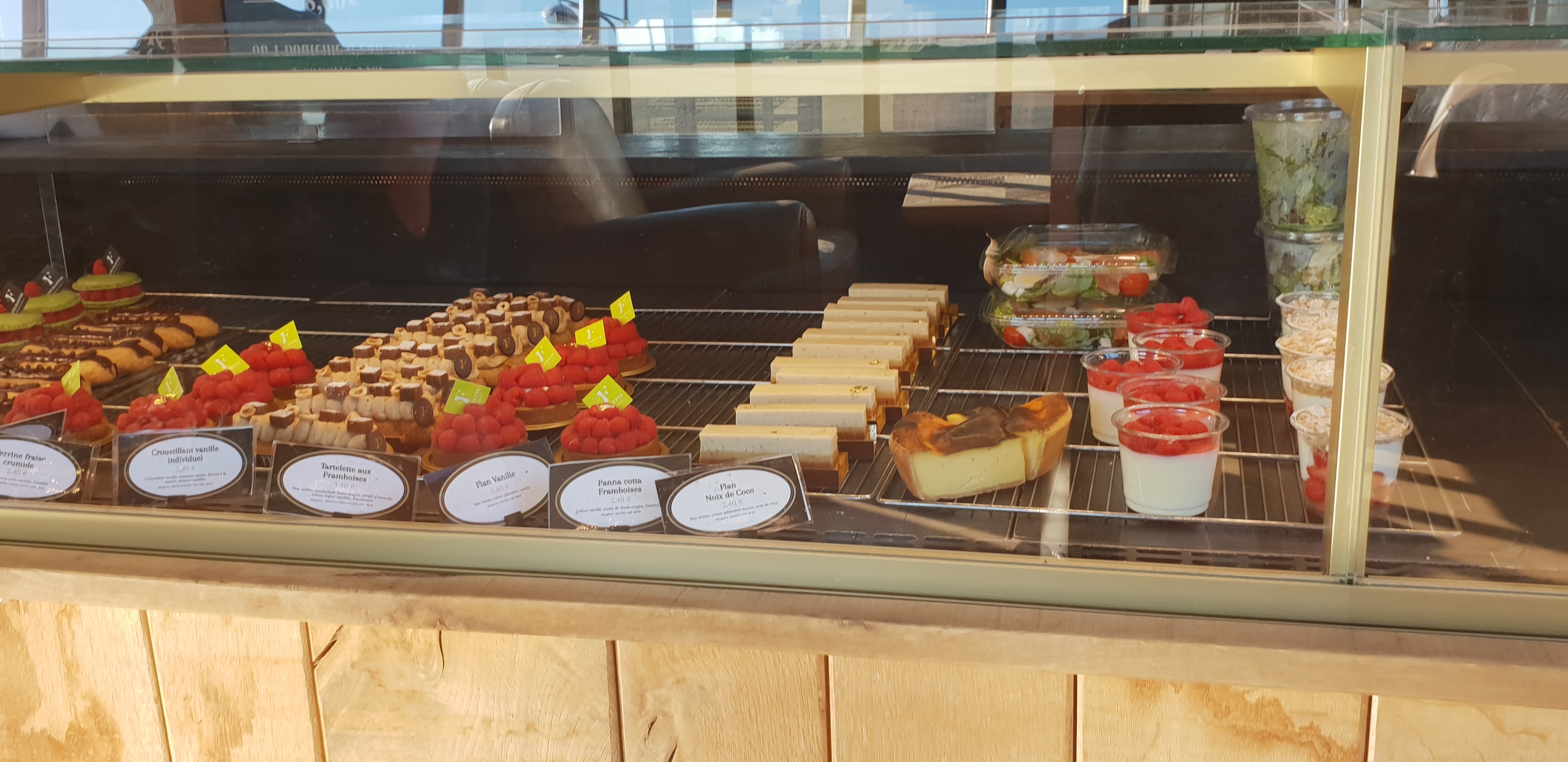 Je me suis arrêtée dimanche pour prendre des salades et pâtisseries. Je parle de ma salade qui était la nordique, franchement déçue par rapport qualité/prix car très peu de saumon et beaucoup de salade verte, pas grand chose a coté pour appeler cela une salade composée. Pâtisserie bonne mais : tarte framboise individuelle, manque de la crème donc les framboises ne tiennent pas, pâte et appareil aux amandes trop épais. Le Paris-Brest revisité est bon bon mais la pâte à choux trop molle avec trop de pâte de noisette (ou pralin) et pas assez de crème pralinée. On aime le Paris-Brest pour l'abondance de crème pralinée et un choux un minimum croustillant. La pâtisserie individuelle est assez chère et je rejoins un commentaire d'il y a 6 mois qui disait que les viennoiserie étaient ridicules. Je confirme, c'est toujours le cas, les croissants, pains au chocolat et pains aux raisins sont ridicules, petits et pas présentables. Désolée pour ces commentaires mais je m'attendais à quelque chose de plus haut standing. Ah si, les cannelés sont très bons mais un peu chères.