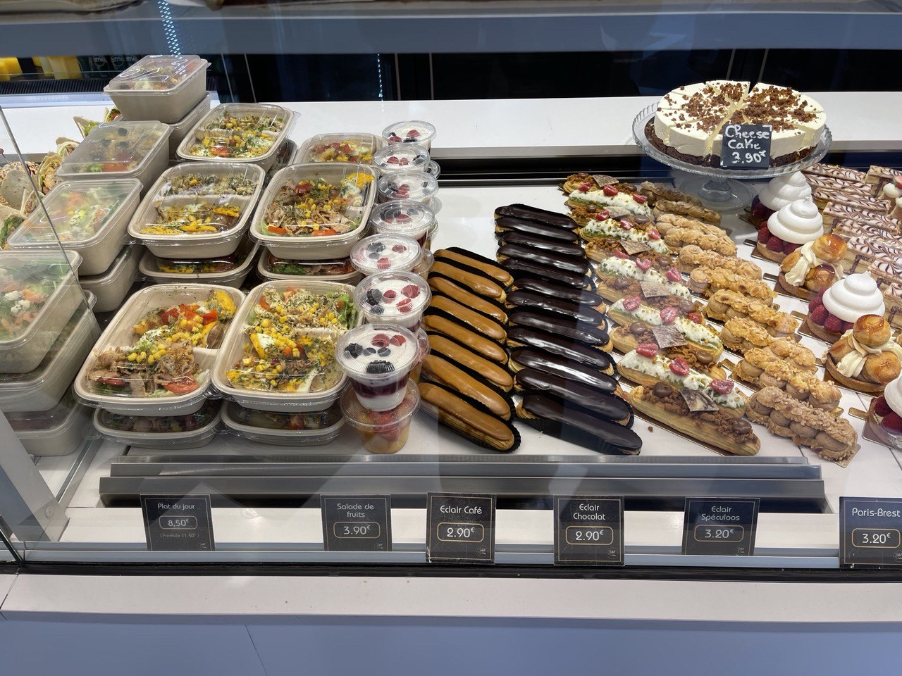 Pâtisseries très bonnes (éclair au chocolat et flan) - tout particulièrement le flan 👍 Sandwich jambon fromage moyen, sandwich rosbeef au poivre excellent. Beaucoup de choix en magasin.