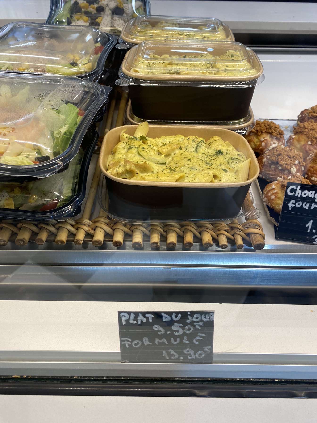 Beaucoup de choix et les produits sont bons mais vous devriez inverser la disposition des produits en mettant les sandwichs et plats dans les vitrines à l' entrée et les desserts au milieu, parce qu'à midi il y a du monde et on doit choisir hyper rapidement sans avoir le temps de regarder ce qu'il y a.