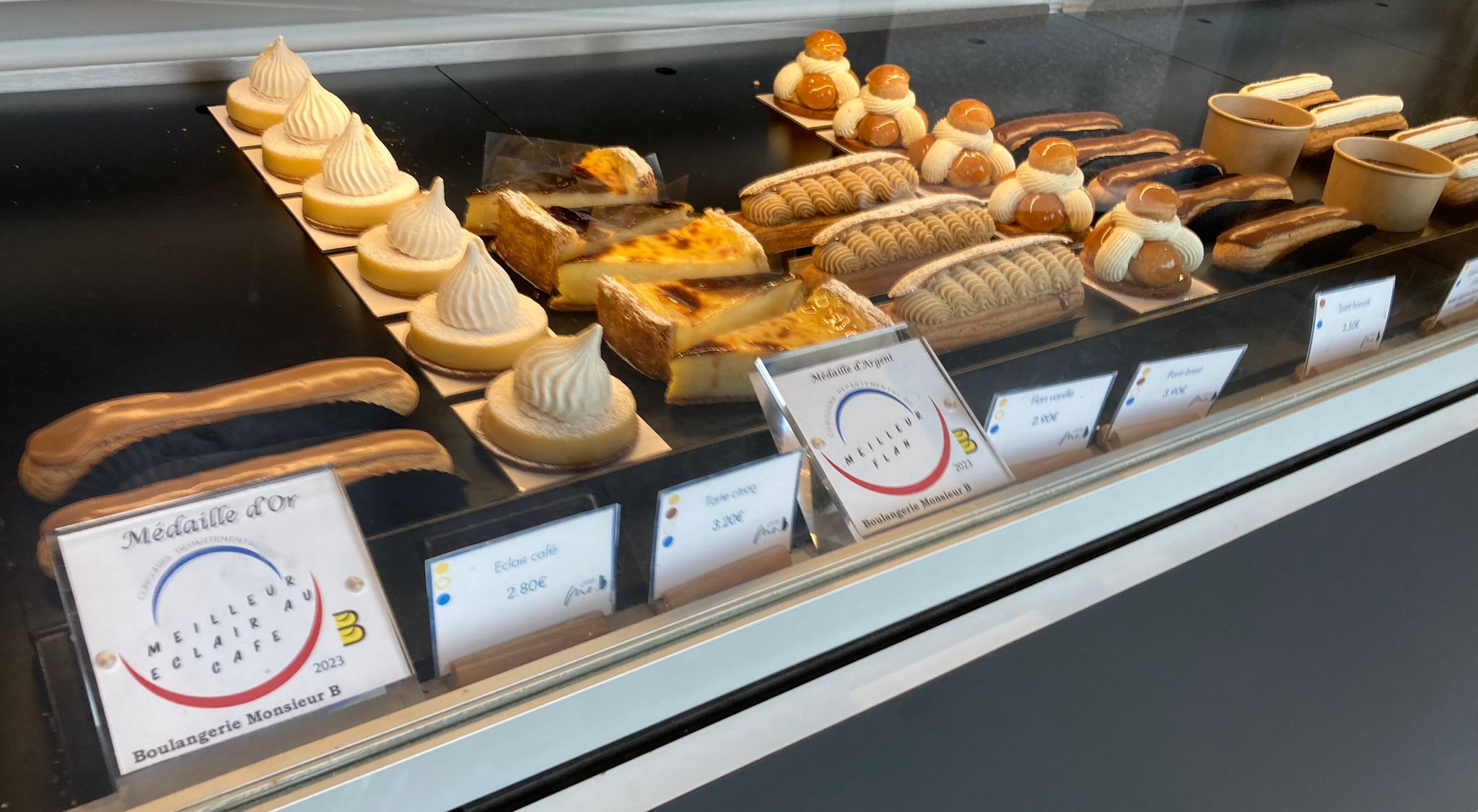 Oh la la que c'est bon! Un éclair avec mousse au chocolat dedans, super bon pain tradition et un incroyable fraisier (beaucoup de crème, j'adore mais manque un peu de biscuit!). Croissants et pains au chocolat très bons mais manquent de beurre, se rapprochent de la brioche. Svp ne réduisez pas la qualité de vos produits une fois bien installés !