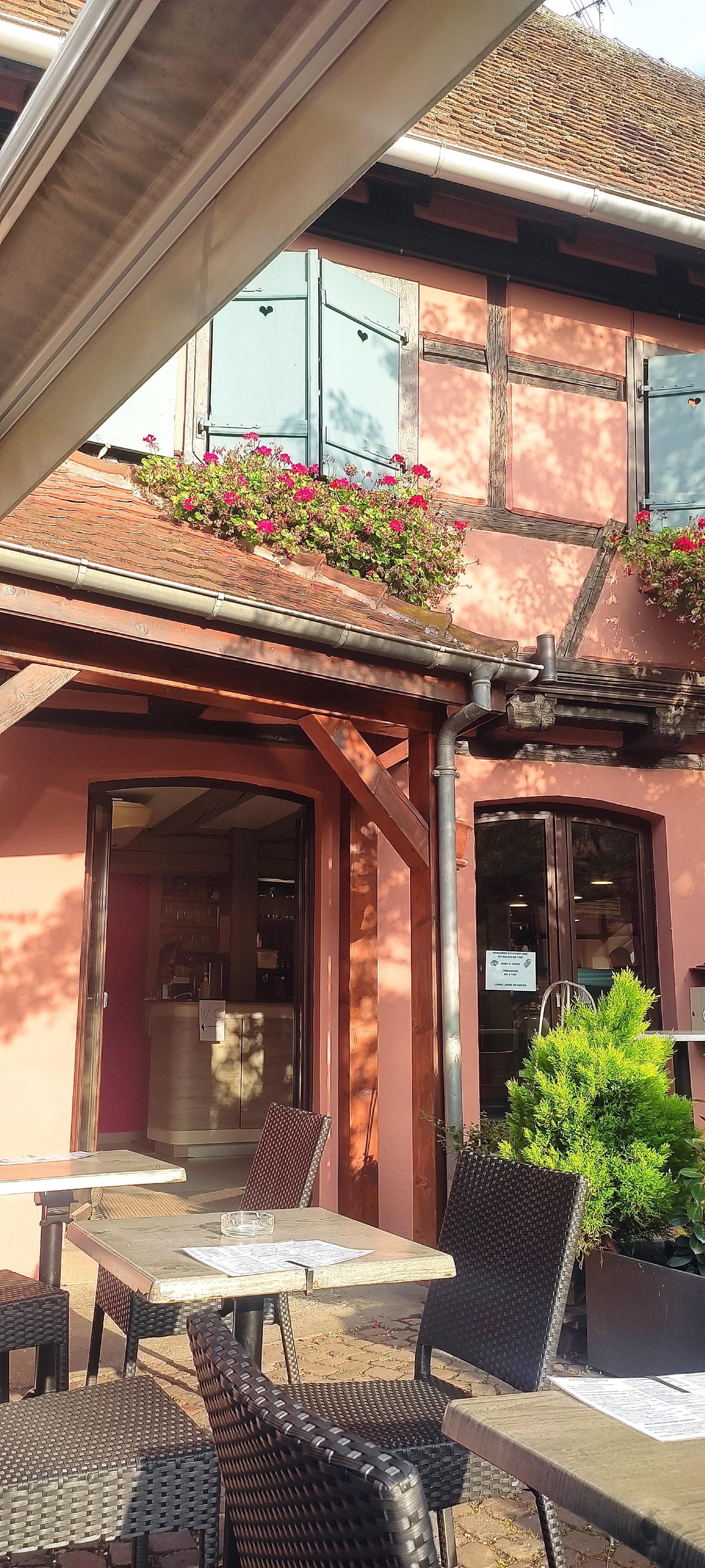 en plein centre touristique d'Eguisheim, le long de la rue principale, cet établissement offre en journée et période estivale la possibilité de s'assoir à sa terrasse ombragée pour boire un café ou se désaltérer, et/ou prendre une collation. Mais il y a constamment du va-et-vient et du bruit à cause des passants qui cherchent une table libre. La serveuse fait de son mieux malgré l'afflux incessant. Si vous êtes seul(e) et cherchez un lieu calme et relaxant pour vous poser, ce n'est pas là qu'il faut venir. NB : devant l'entrée de la boutique-patisserie, un stand propose de délicieuses glaces maison (à emporter, ou à déguster en terrasse avec une boisson, si ça vous tente)!