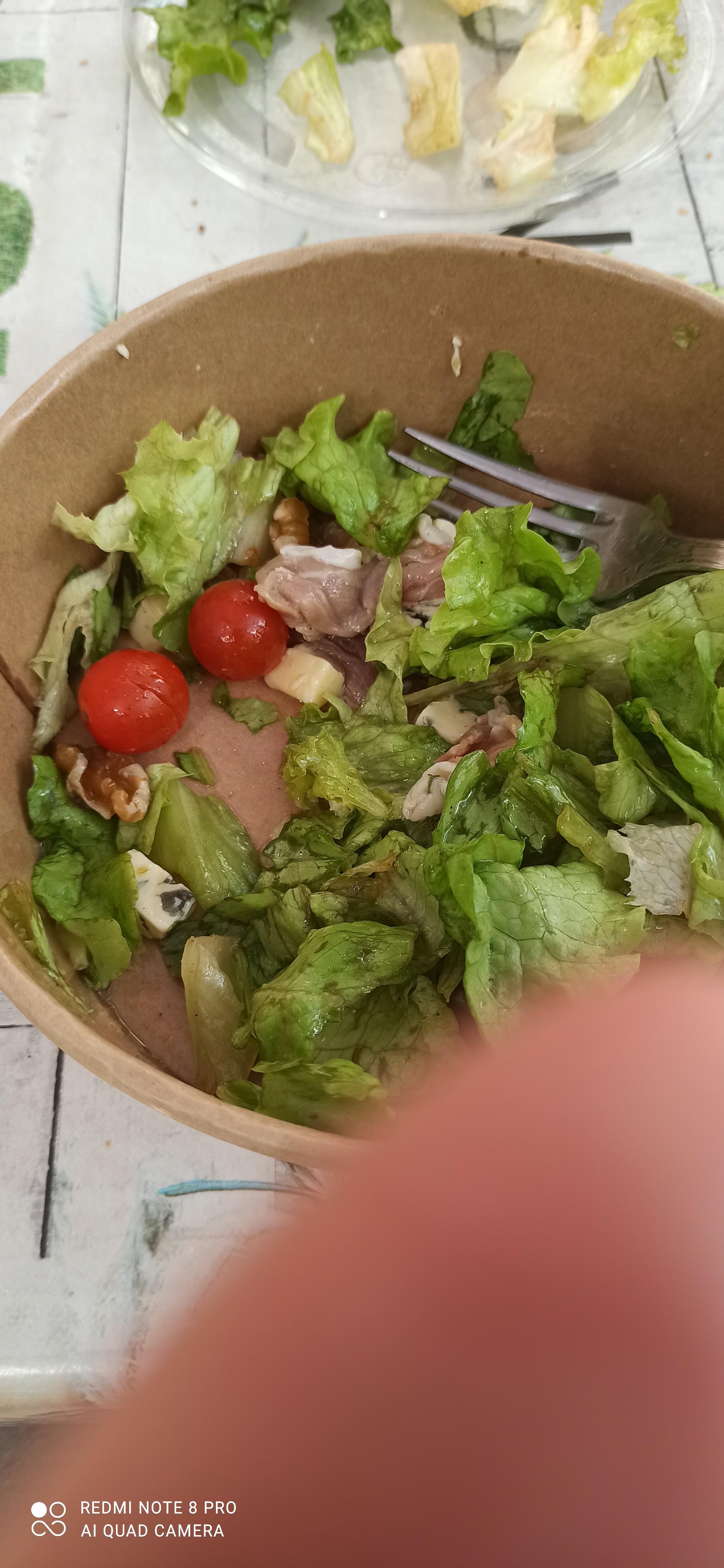 J'y vais de temps en temps , là pour prendre du pain et deux salades auvergnates, le pain basic, par contre attirée par les salades qui avaient l'air bonnes, très déçue, en fait les 3 noix , les 3 morceaux de fromage, les 3 morceaux de jambon et les 3 tomates cerises sont sur le dessus une fois les salades mélangées, cherchez les , et la salade pas fraîche du jour, alors ni bon ni mauvais mais pour 5,90 € , si cette salade (et ce doit être le cas) est de la veille , il serait bon de la solder en prévenant les clients , je n'en prendrai plus eh voilà le gâchis en photos parce que du coup pas mal de feuilles abîmées 🤔☹️