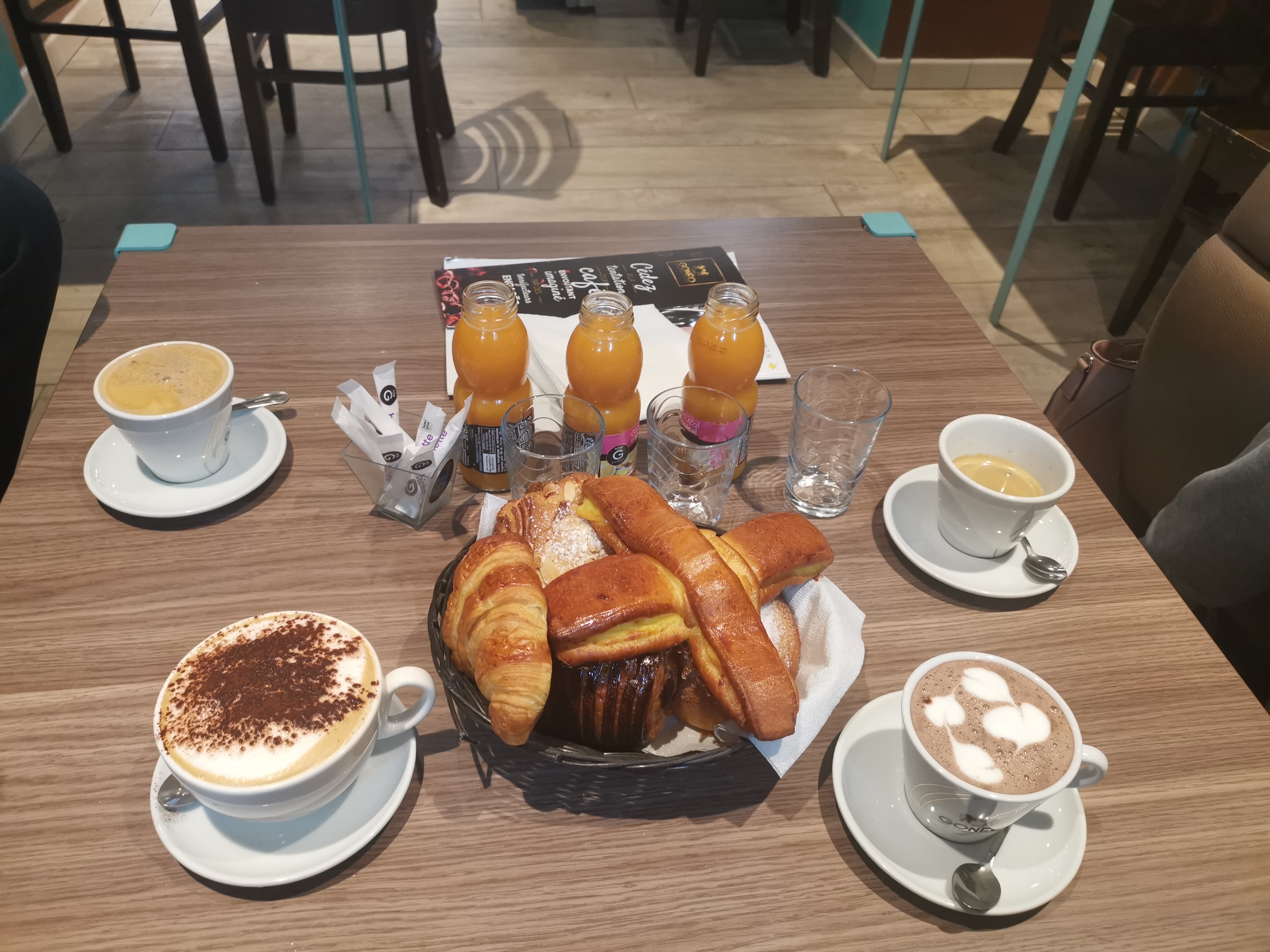 3 pains chocolat (1,20 € x 3) et 2 cappuccinos (€?) au total. 11h20 ! Prix totalement injustifié tant pour les produits que pour le lieu.