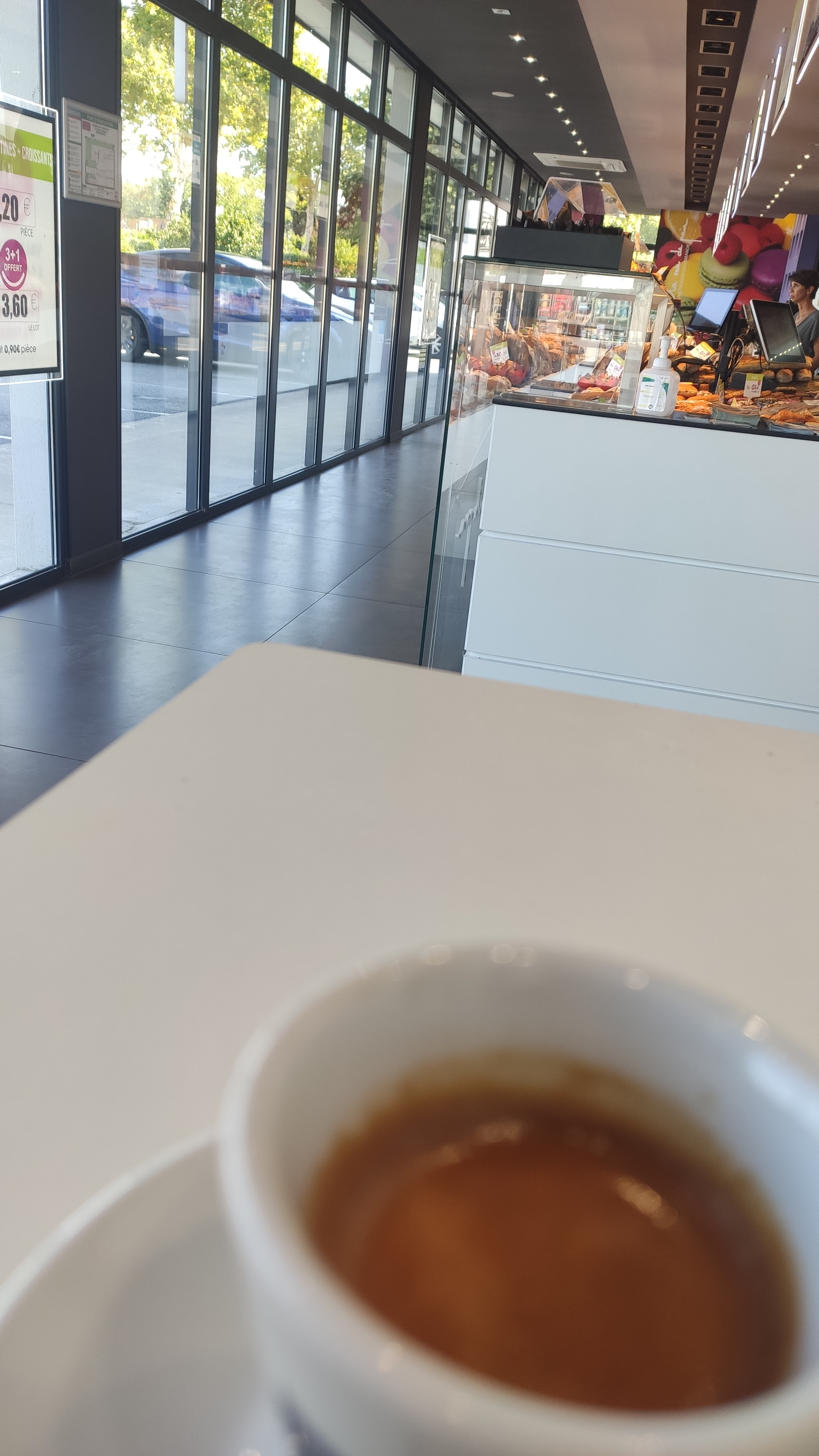 Très bien et très bon ! Vous pouvez manger vos gâteaux ou y prendre un petit déjeuner. Chocolat chaud café jus de fruits etc. Allez y ! 3 vienoiserie ou patisserie ou pain acheté 1 offert.