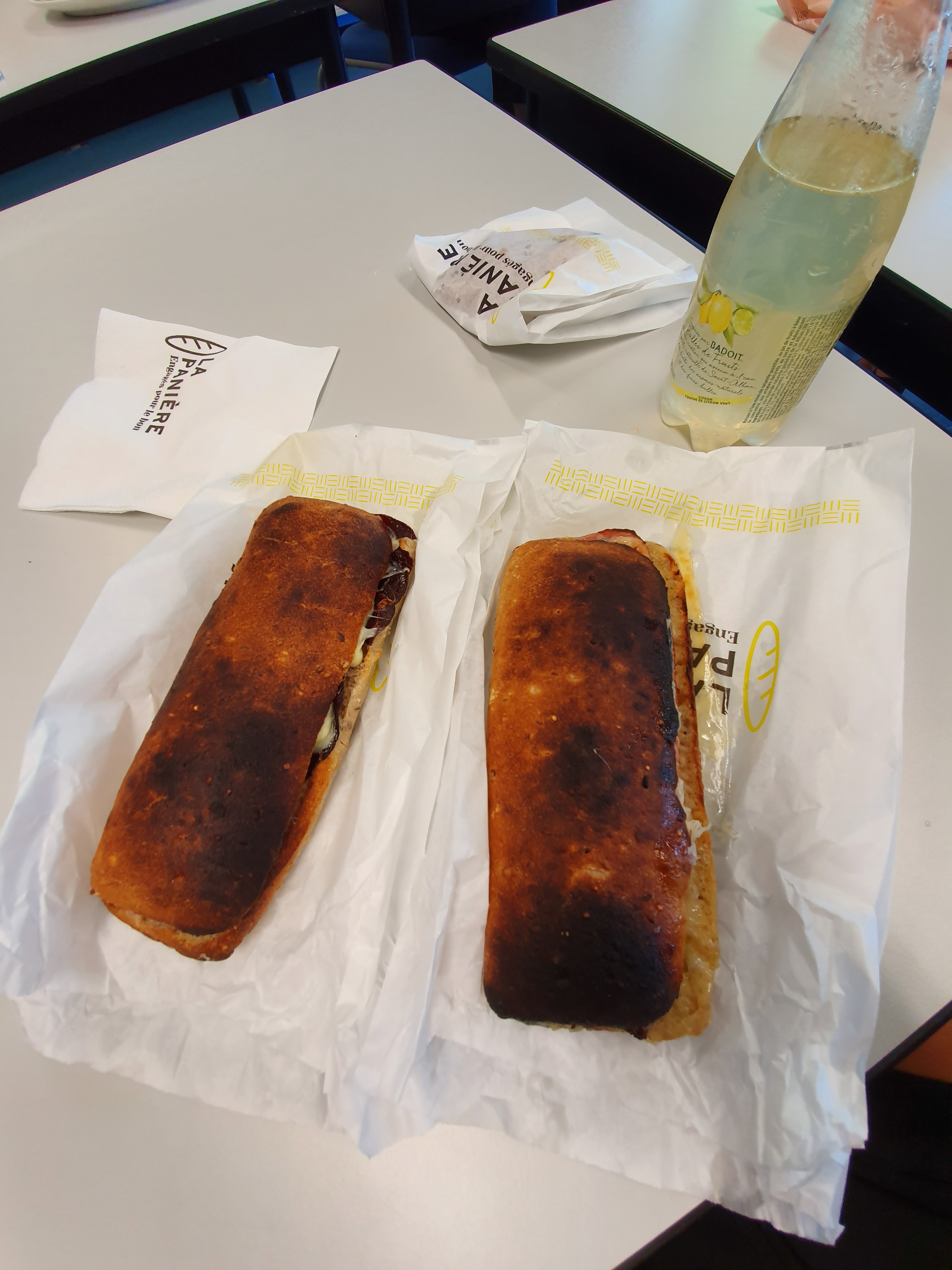 Je vous laisse constater par vous-même les paninis. Ils sont brûlés! À 20 euros les deux menus, c'est sincèrement du vol. Je pense que le personnel souhaite faire de son mieux mais oublier la commande et avoir une nourriture au goût de brûlé c est a la limite de l'irrespect. De plus, on ne nous a pas avertis que nos paninis étaient ainsi. Très déçue par l'incompétence!