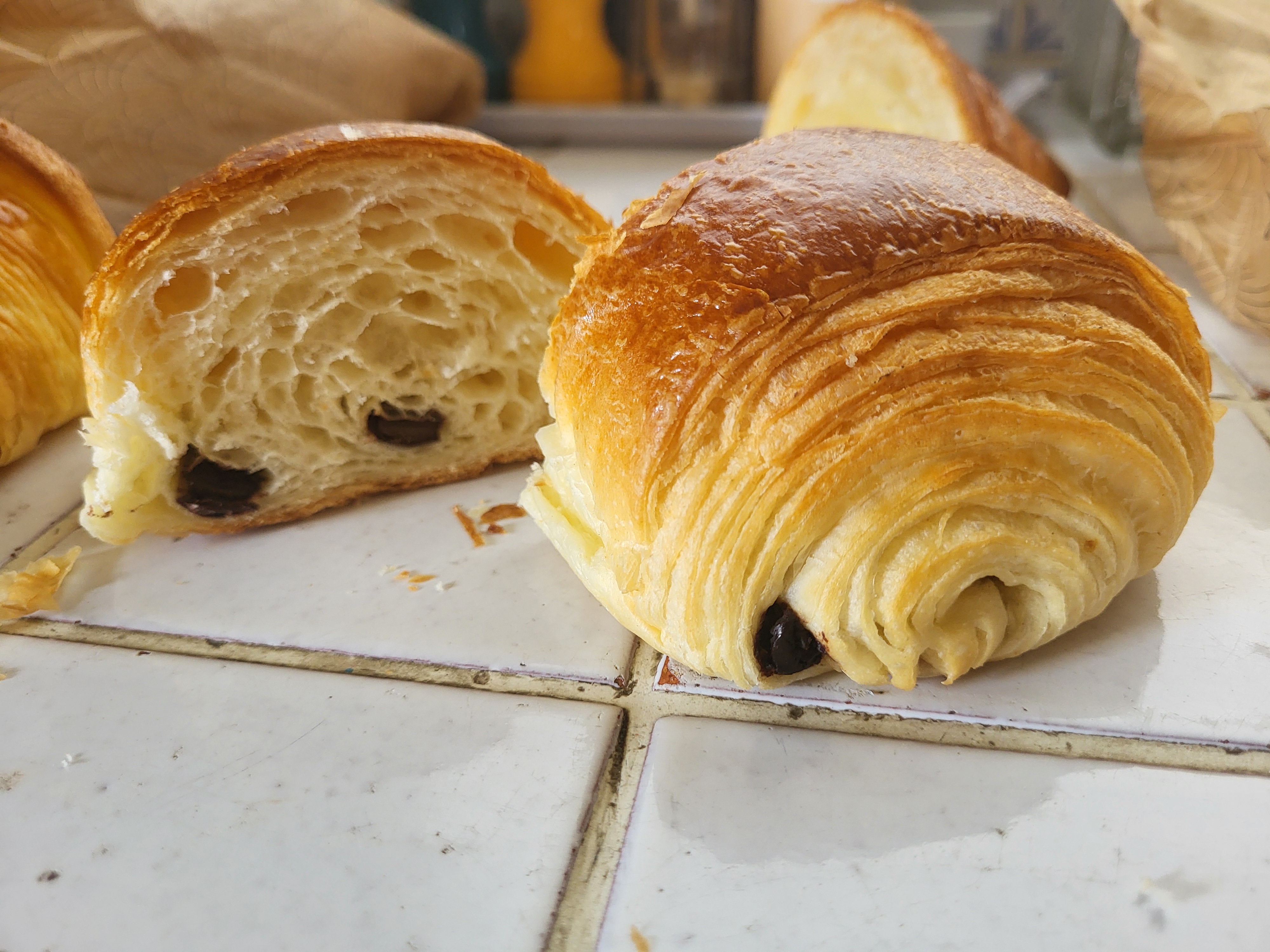 Bonjour. Viennoiseries Maison .. Les croissants sont magnifiques et délicieux, l'odeur et un bonheur. Le pain chocolat à un vrai goût, léger en beurre, on sens bien le chocolat, excellent. Le chausson aux pommes est surprenant, visuellement différents c'est un régal. Je n'ai pas goûté les pains. C'est devenu rare de trouver des artisans qui travaillent encore eux même leurs produits. Merci.