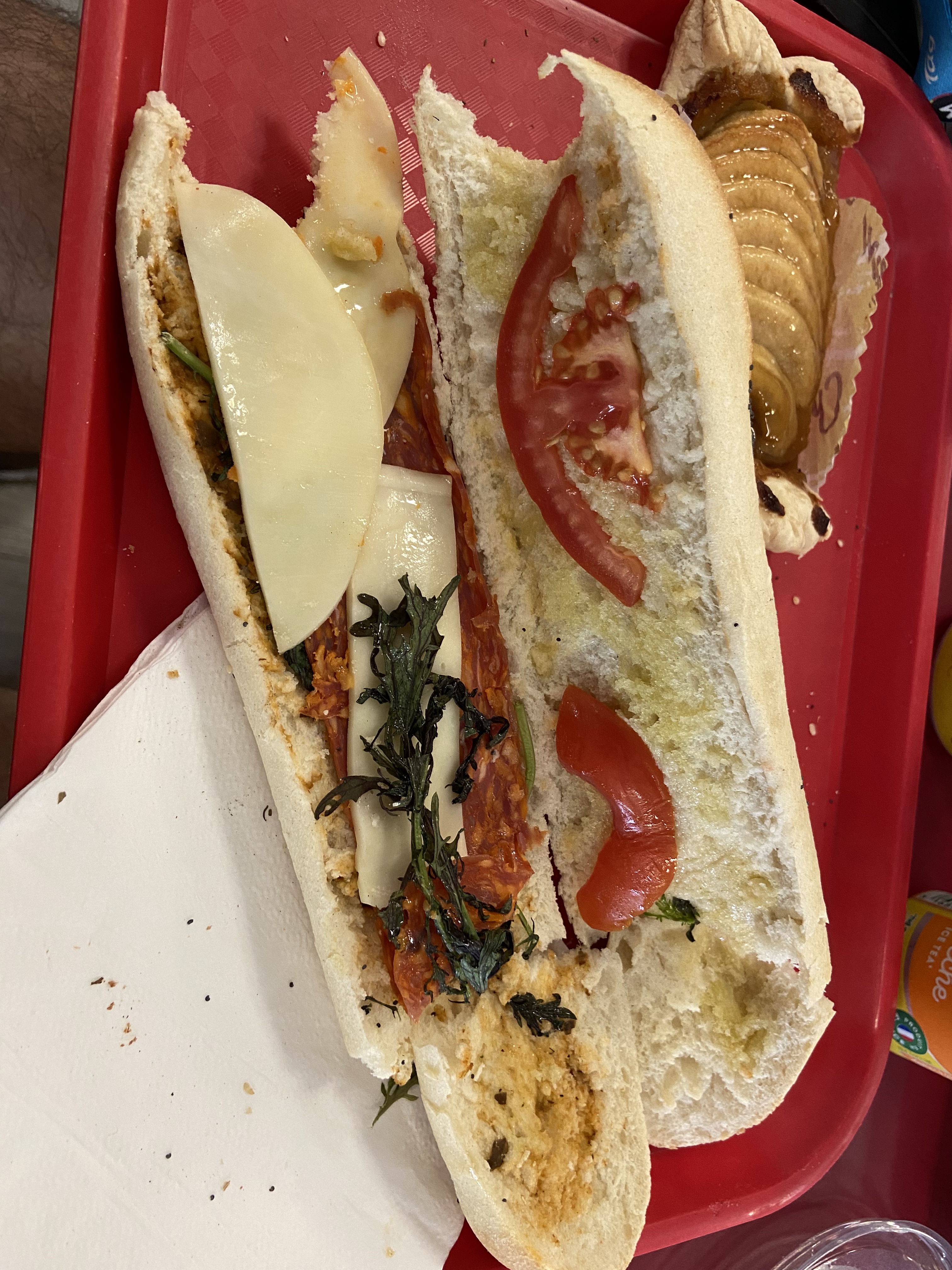 Le sandwich est composé d’une demie feuille de salade, 1 tomate séchée et un filet d’huile d’olive. Il manque de garniture…