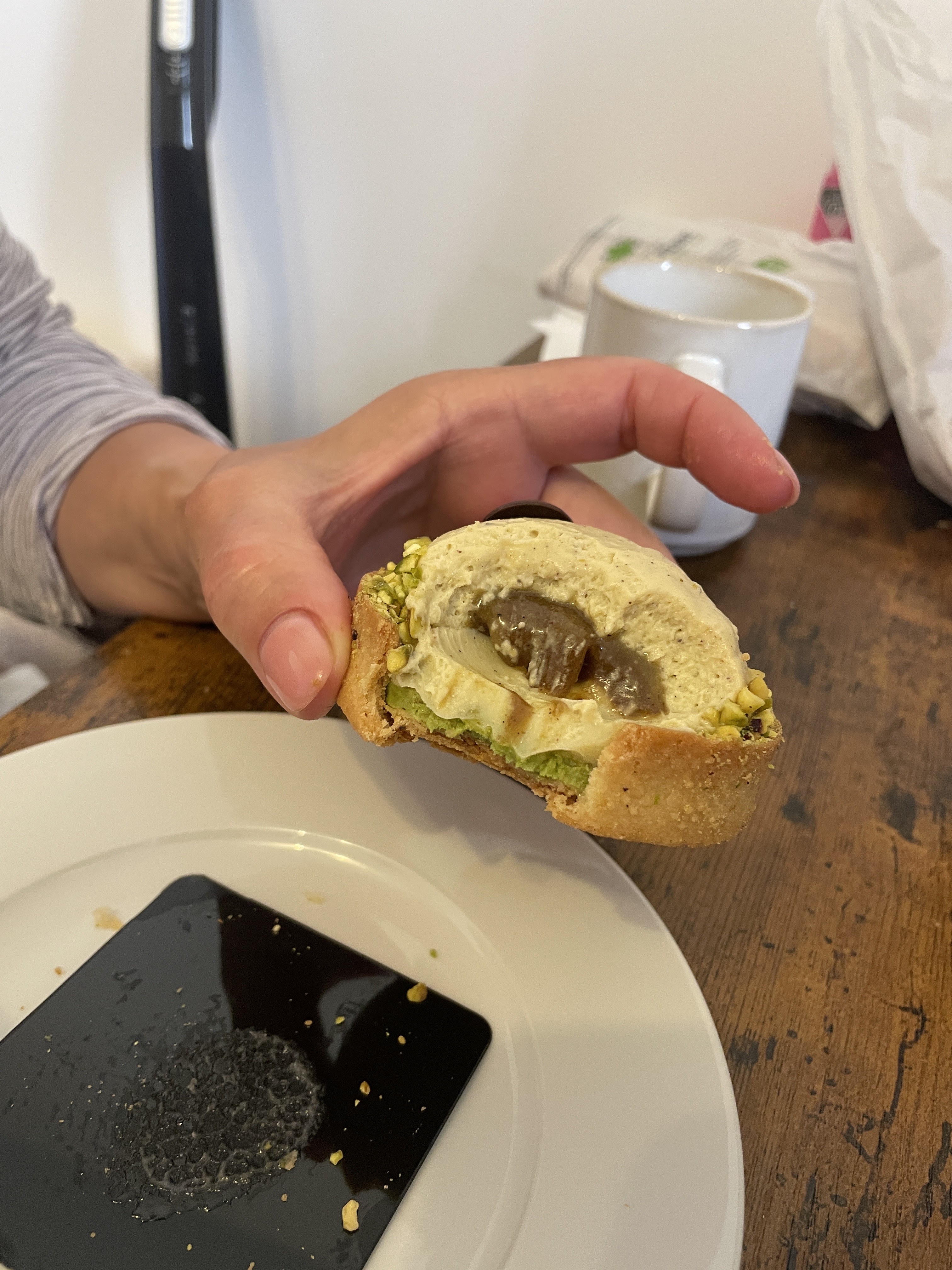 J'y ai acheté une religieuse à la vanille et un mille feuille pistache. Autant dire que j'ai été désagréablement surpris de constater que le mille feuille était congelé. En payant près de 10€ les 2 pâtisseries c'est inadmissible