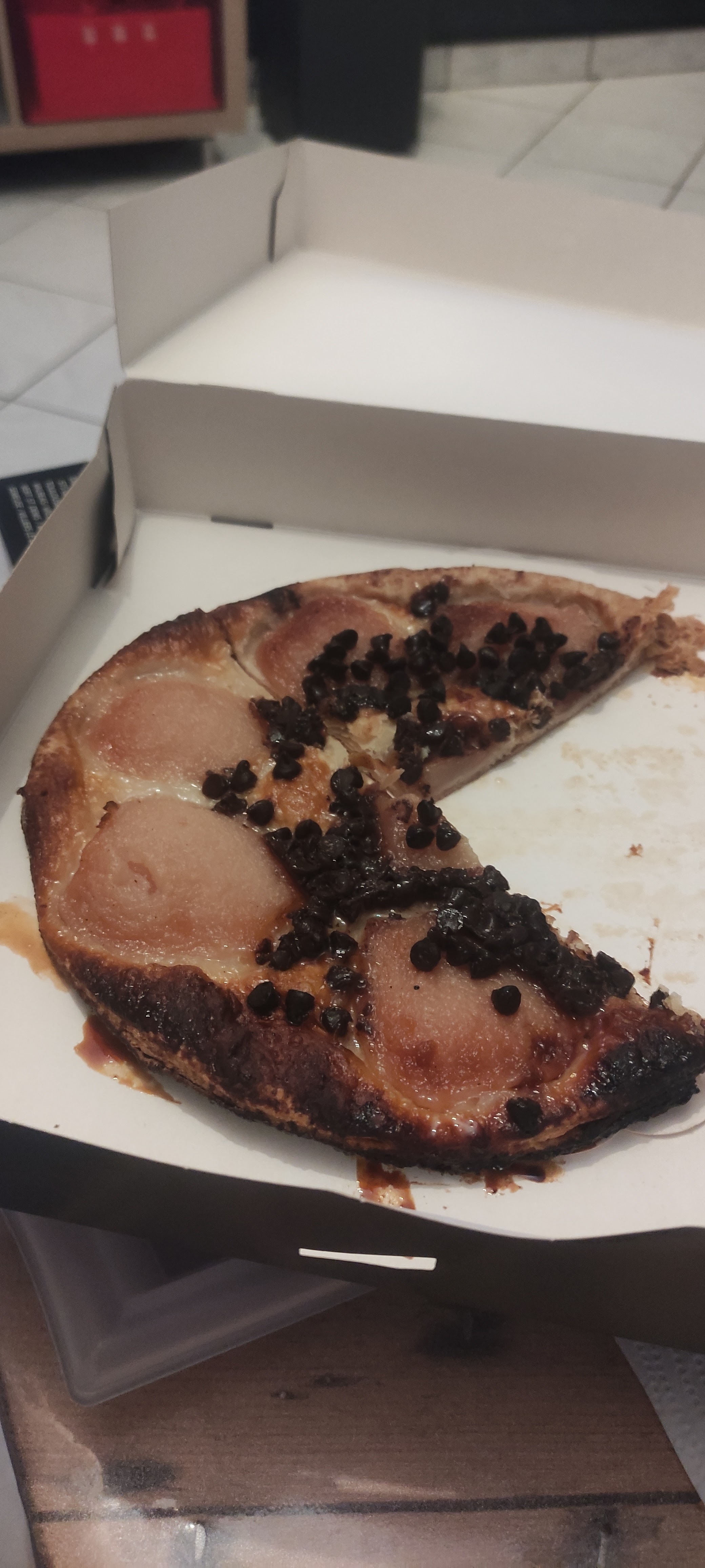 Les photos parlent d'elles mêmes ! Tarte poire/ chocolat..... 1ere photo, ce a quoi ça devrait ressembler, 2eme photo, ce qu'on a reçu..... Enfin si on peut parler de tarte, parce que ça ne ressemble a rien et surtout pas a une tarte ! Franchement minable !
