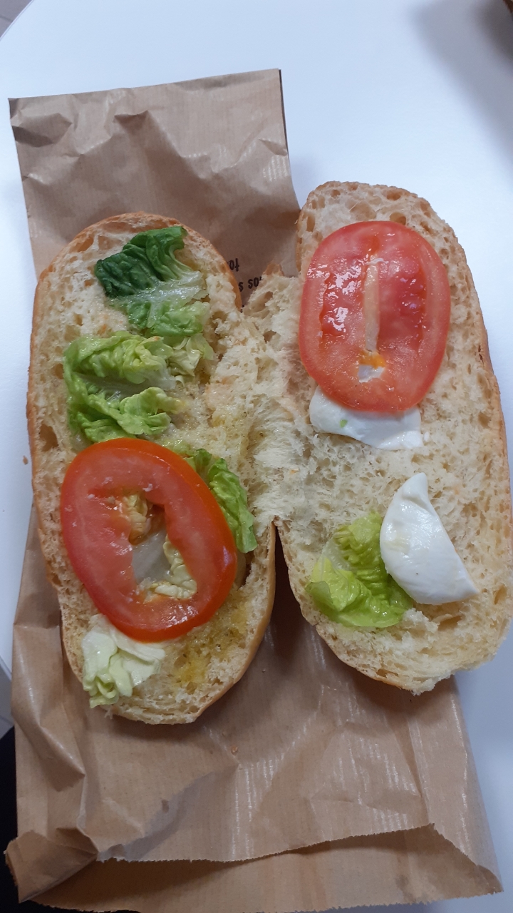 J'ai acheté un sandwich au pain viennois garni tomates et mozzarella. Je devrais plutôt mettre tomates au singulier car lorsque je suis rentrée chez moi pour le manger et que je l'ai ouvert j'ai été très surprise du MANQUE de garnitures. Par rapport au prix payé je trouve que c'est vraiment abusé :( Donc, un conseil : si vous achetez ce genre de sandwich demandez à ce que la vendeuse l'ouvre devant vous.....