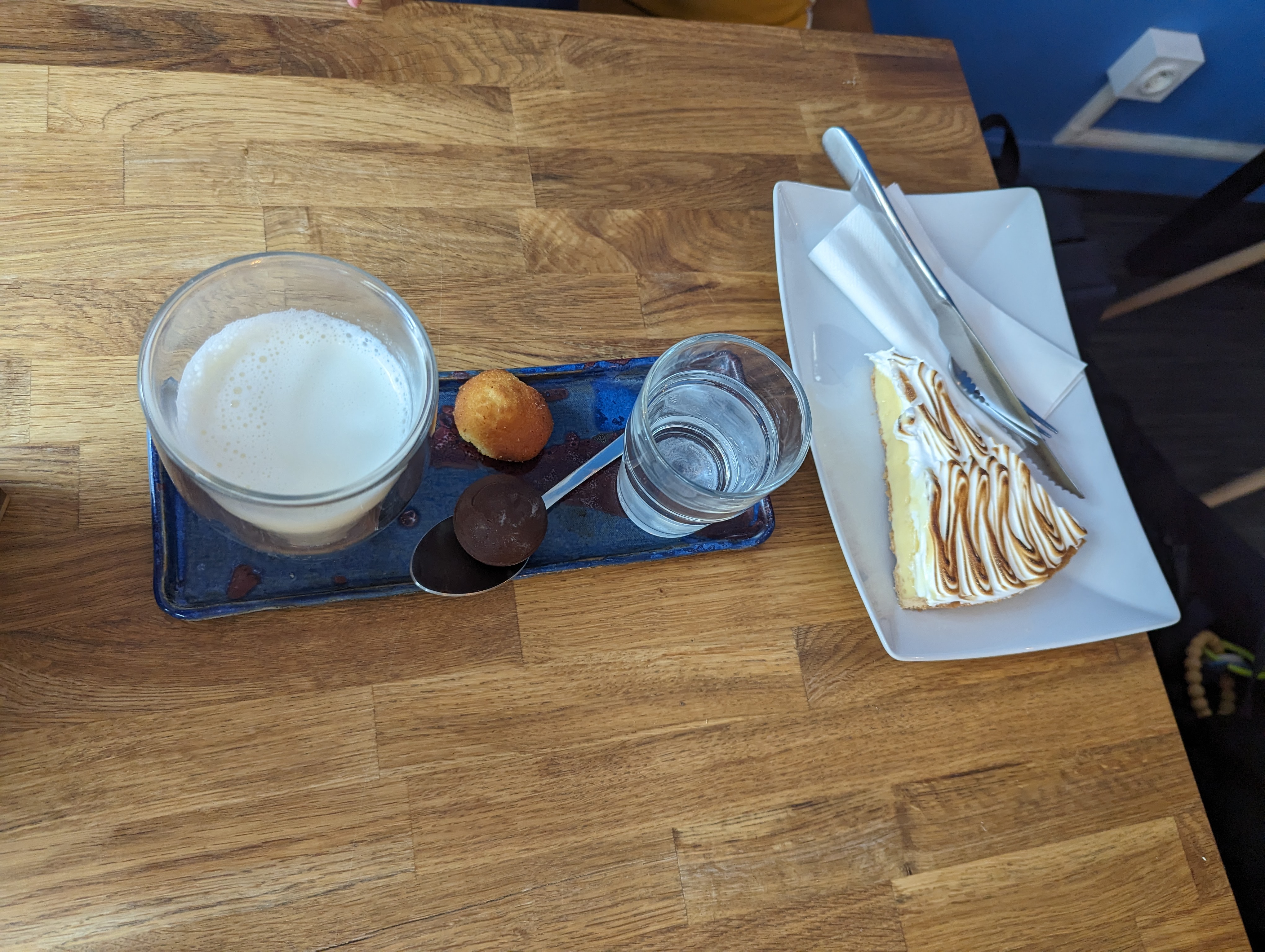 Charmant endroit avec des pâtisseries à tomber !! Goûtez absolument leur tarte au flan qui est une merveille : le flan a un réel goût d'œuf, c'était surement le meilleur que j'ai jamais goûté ! La tarte au citron meringuée et le cookie étaient aussi excellents. J'y retournerai avec plaisir !