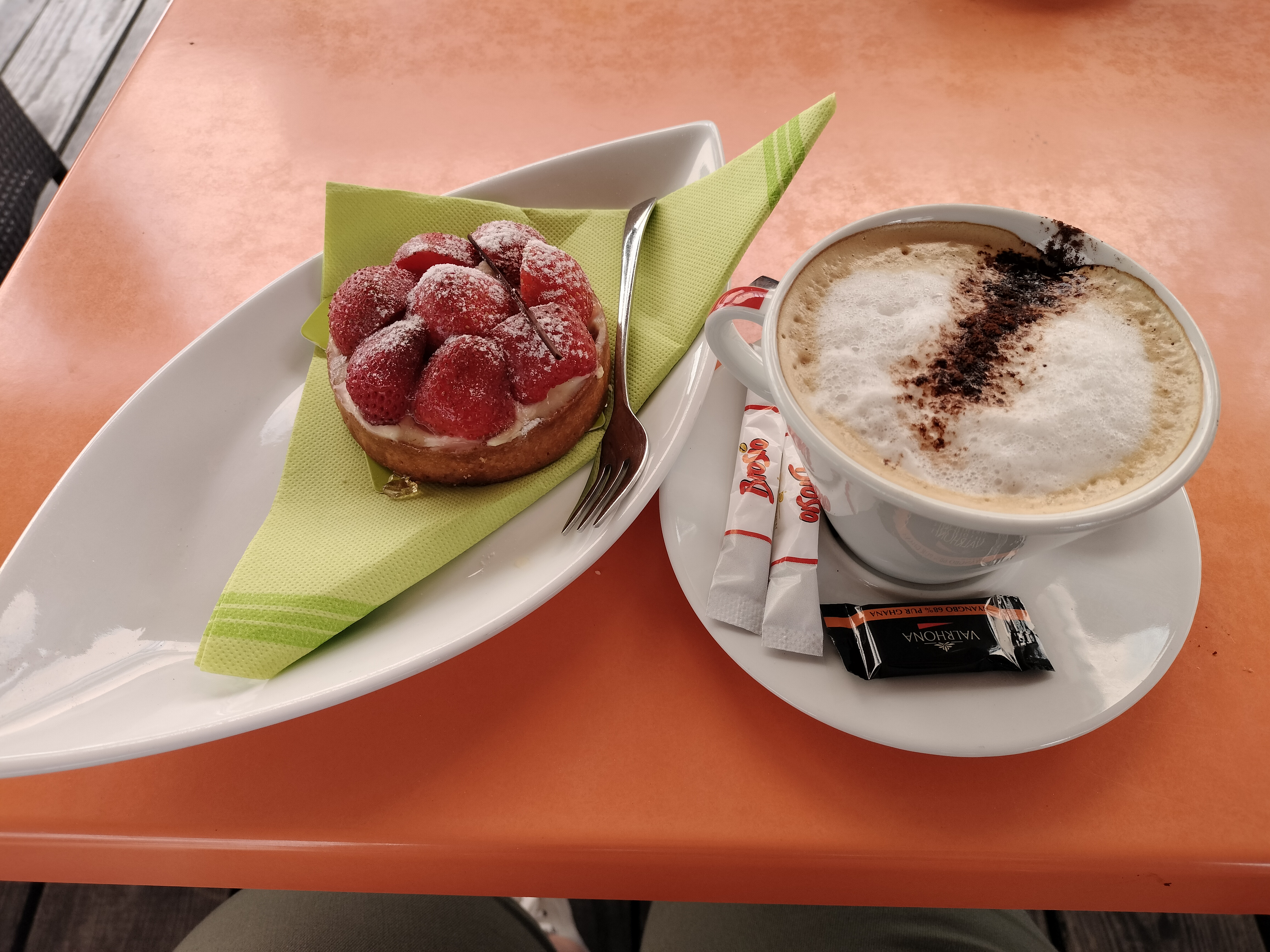 Tres bonnes pâtisseries prises en terrasse servies par un jeune homme très poli