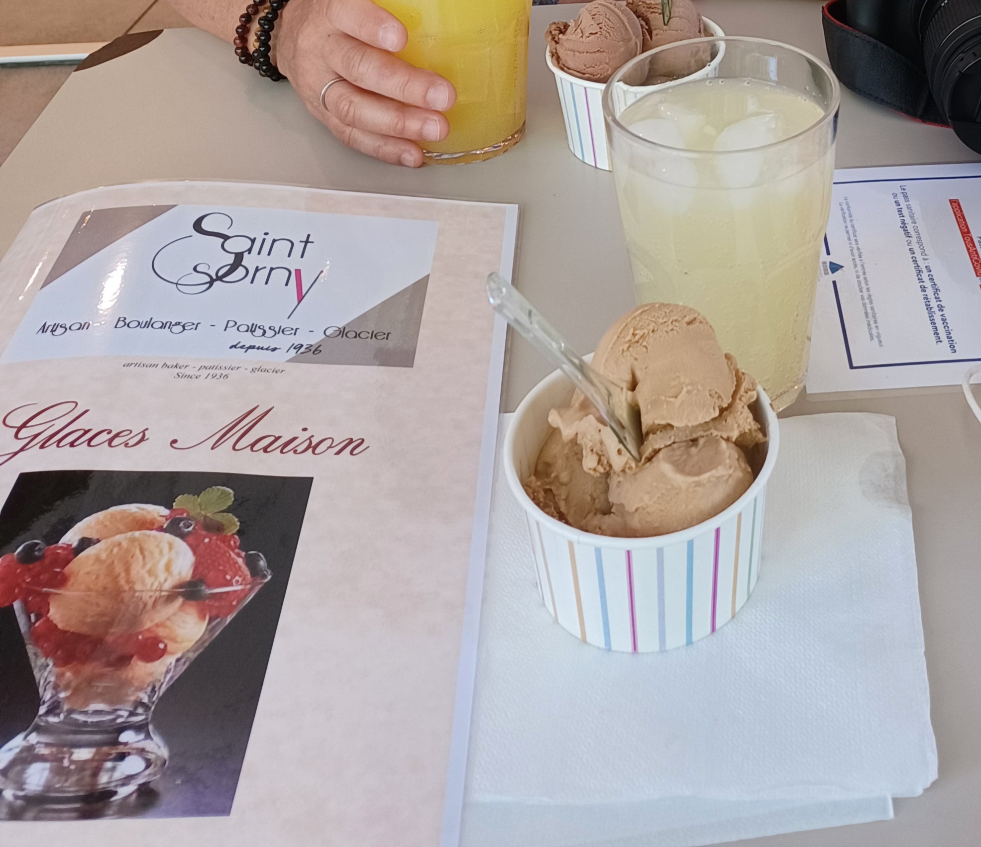 Très sympathique. Patisseries ainsi que glaces et café dégustés en salon de thé et très bonnes ! Le pain sera pour ce soir et il est appétissant !