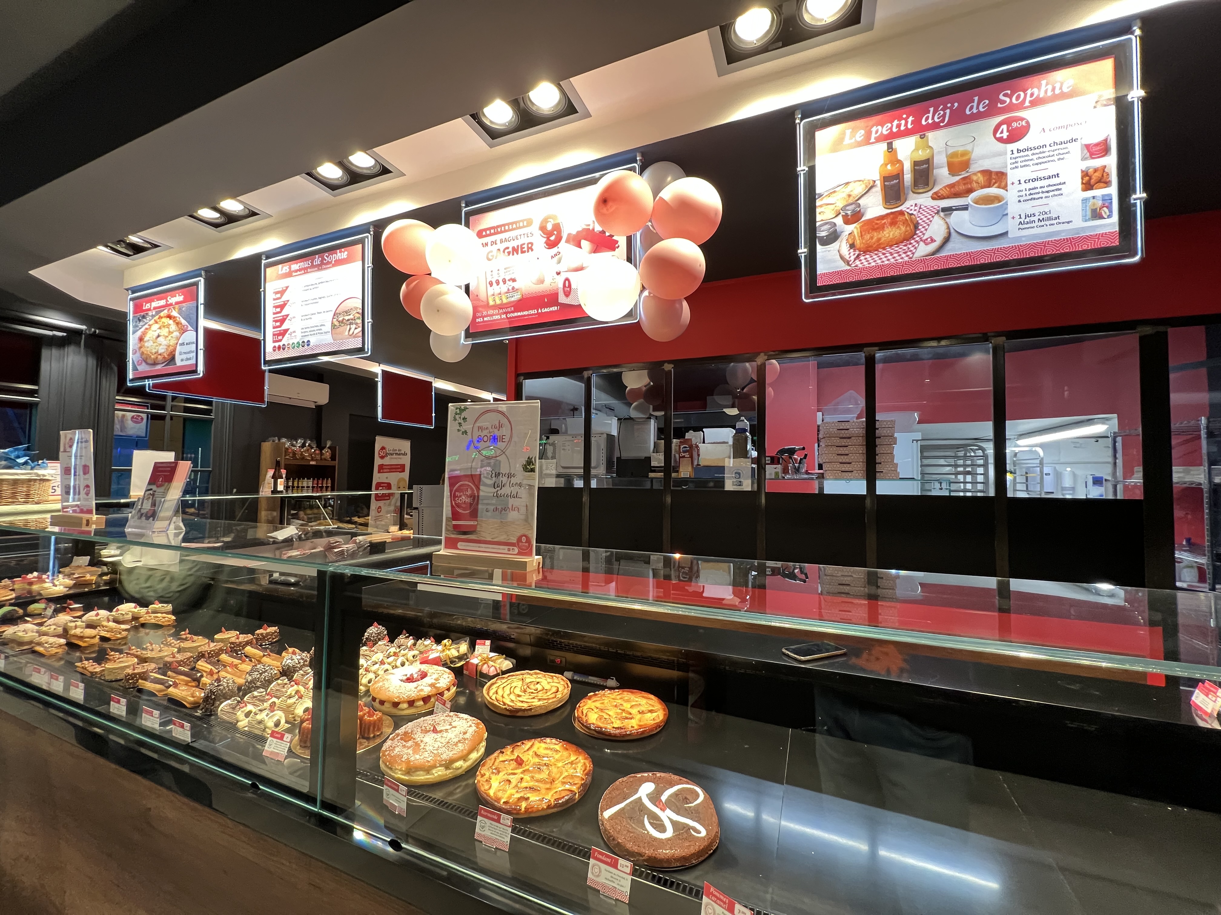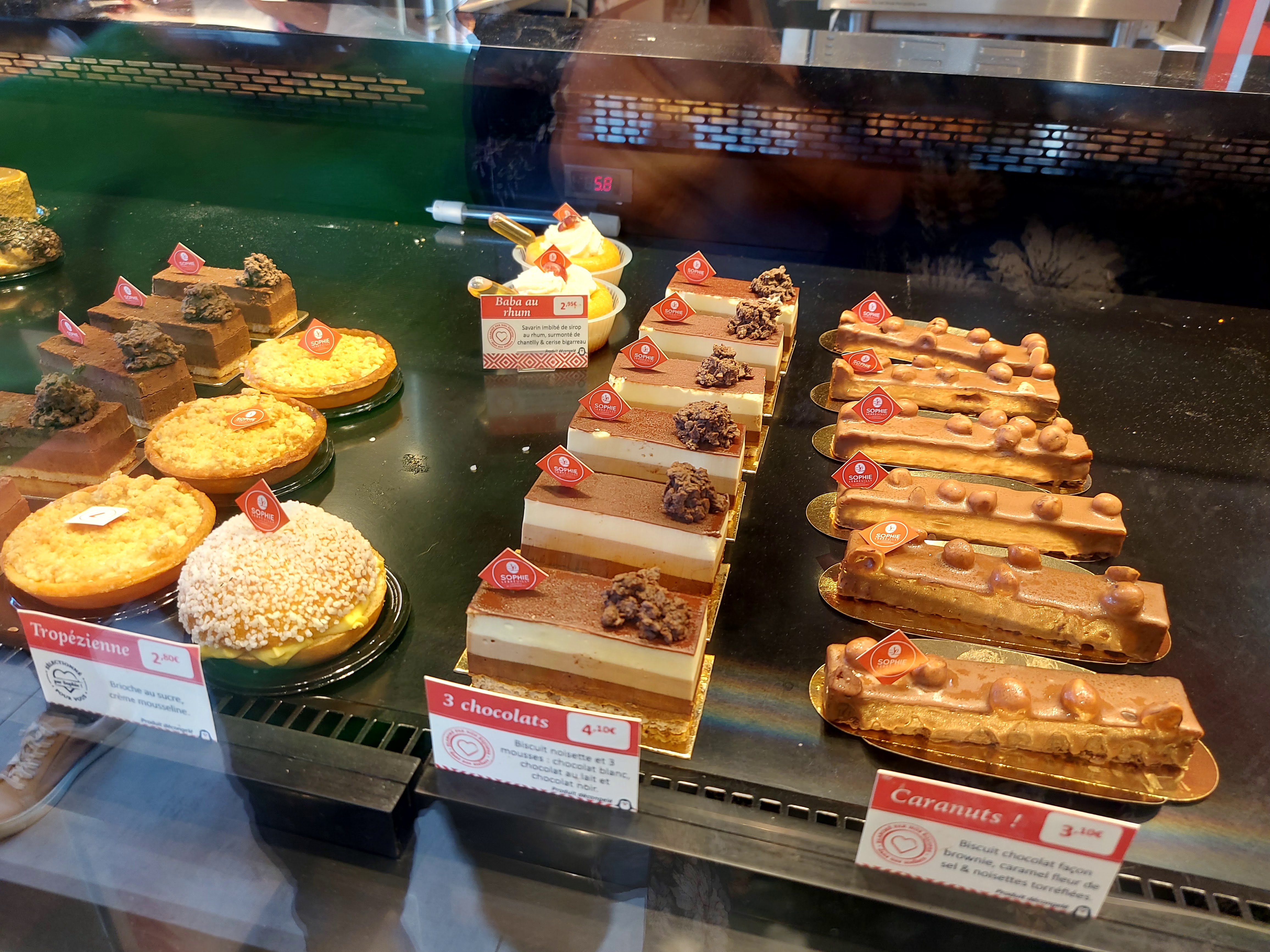 Beau choix de pâtisseries gourmandes, la baguette de Sophie me convient (croûte fine et croustillante avec une mie moelleuse et généreuse) mais les viennoiseries font trop industrielles et manquent de beurre.